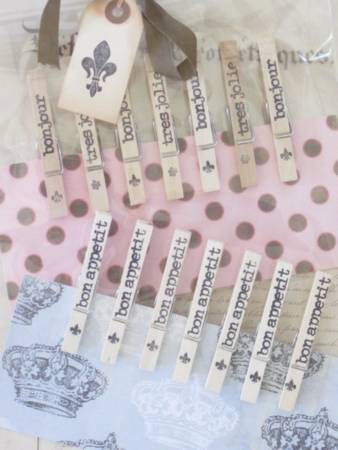 ![]() Regular sized hand stamped clothespins partnered with decorative cards; nestled in cello bag and tied with a bow wholesale $5 each (min. 6 assorted) |