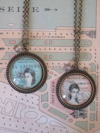 ![]() Vintage style necklace; assorted Parisienne ladies captured under glass. Hangs from lovely 24" chain; medallion is 1 1/2" wholesale $12 each (min. 6 per style) |