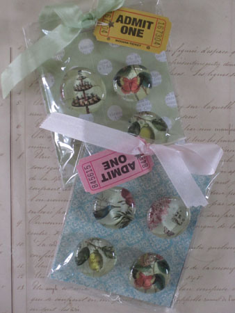 ![]() A colorful and eclectic assortment of vintage images, these sweet 1" magnets are captured on a small magnet board. Four magnets per set, wrapped with cello and ribbon. 3" x 4" wholesale $7.50 each (min. 6 assorted) |