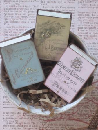 French ![]() small match box collaged with assorted French graphics; touched with glitter wholesale $2 each (min. 12 assorted) |