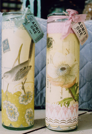 ![]() 8" unscented candle with vintage inspired bird or floral collage embellished with rayon ribbon and a touch of glitter wholesale $9 each (min. 3 per style) |